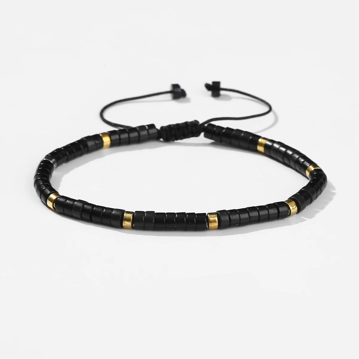 Ce bracelet s’habille de perles carrées en jaspe noir, rythmées par de discrets anneaux dorés. Son fil noir tressé et son système coulissant garantissent un ajustement parfait. Il s’accorde aussi bien à un look urbain qu’à une tenue bohème. Un accessoire sobre qui habille délicatement le poignet.