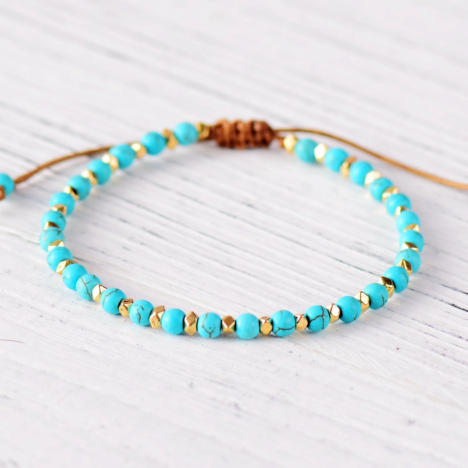 Ce bracelet fin associe perles turquoises à de délicates touches dorées pour un contraste subtil. Le cordon en cire marron et le nœud coulissant garantissent un ajustement parfait. À porter seul ou en accumulation pour une allure bohème et discrète.