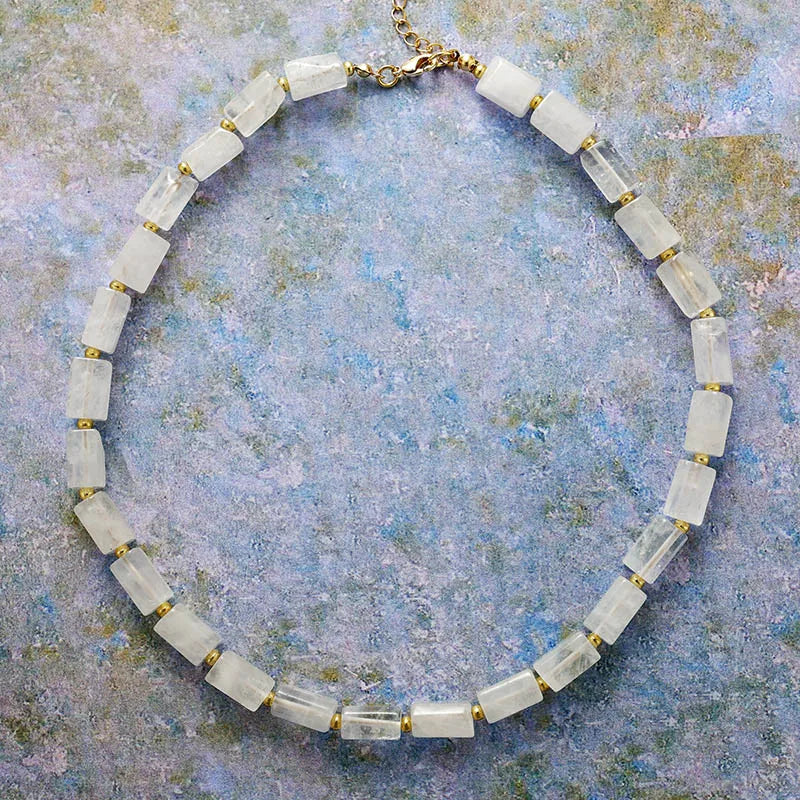 Ce collier minimaliste marie la douceur translucide du quartz clair à de délicats intercalaires dorés. Sa ligne épurée sublime le cou avec élégance. L’ajustement choker offre une allure contemporaine et raffinée. Idéal pour sublimer un look quotidien ou ajouter une touche lumineuse à une tenue habillée.