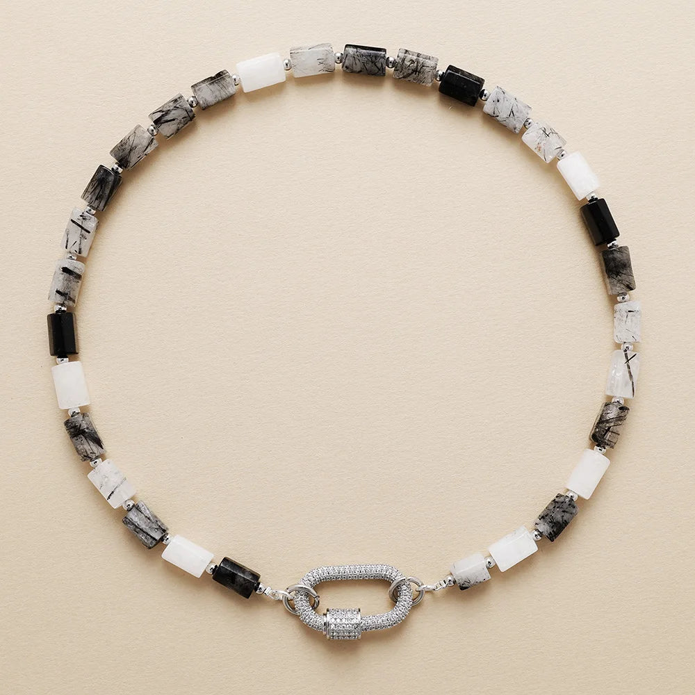 Ce choker associe des perles rectangulaires en Quartz Rutile aux motifs marbrés pour un rendu graphique unique. Le fermoir à vis plaqué argent apporte une touche d’éclat discret et assure un maintien sûr. Son design minimaliste mettra en valeur votre nuque avec élégance. Idéal pour affirmer un style contemporain et raffiné.